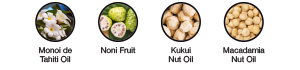 Monoi de Tahiti Oil: From Tahitian Coconut and Tiare (Gardenia) Flower, this blend deeply hydrates the skin without stripping its natural oils to nourish, condition and soothe skin. Anti-Aging properties help increase skin elasticity and prolong the life of a tan.